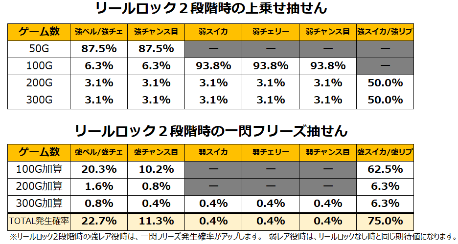 また、「リールロック2段階時における強レア役の一閃フリーズ発生確率アップ」に関しての質問も頂いておりますので今回は、リールロック2段階発生時のゲーム数上乗せ抽せんと一閃フリーズ発生抽せんを公表させて頂きます。