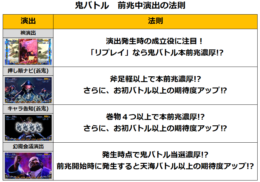 鬼バトルの法則は色々出ていますが、前兆中の演出でも法則があれば教えてほしいです!!!