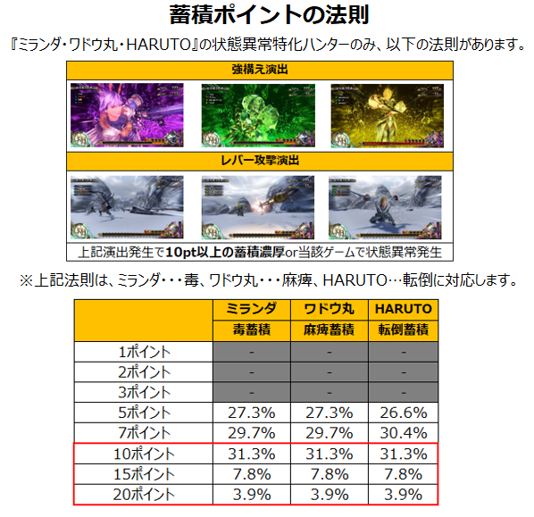 ハンターの異常状態蓄積に関しては、『ミランダ・ワドウ丸・HARUTO』の状態異常特化ハンターに演出法則があります。